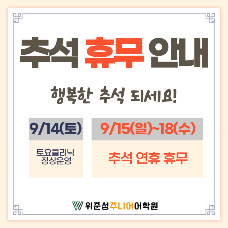 9월 15일 일요일부터 9월 18일 수요일까지 추석 연휴로 쉬어가오니 즐거운 명절 보내시길 바랍니다.^^
