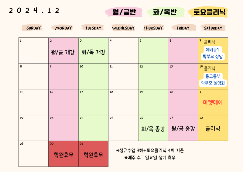 *12월 30일~31일(월~화) 수업 횟수 초과로 휴무입니다.